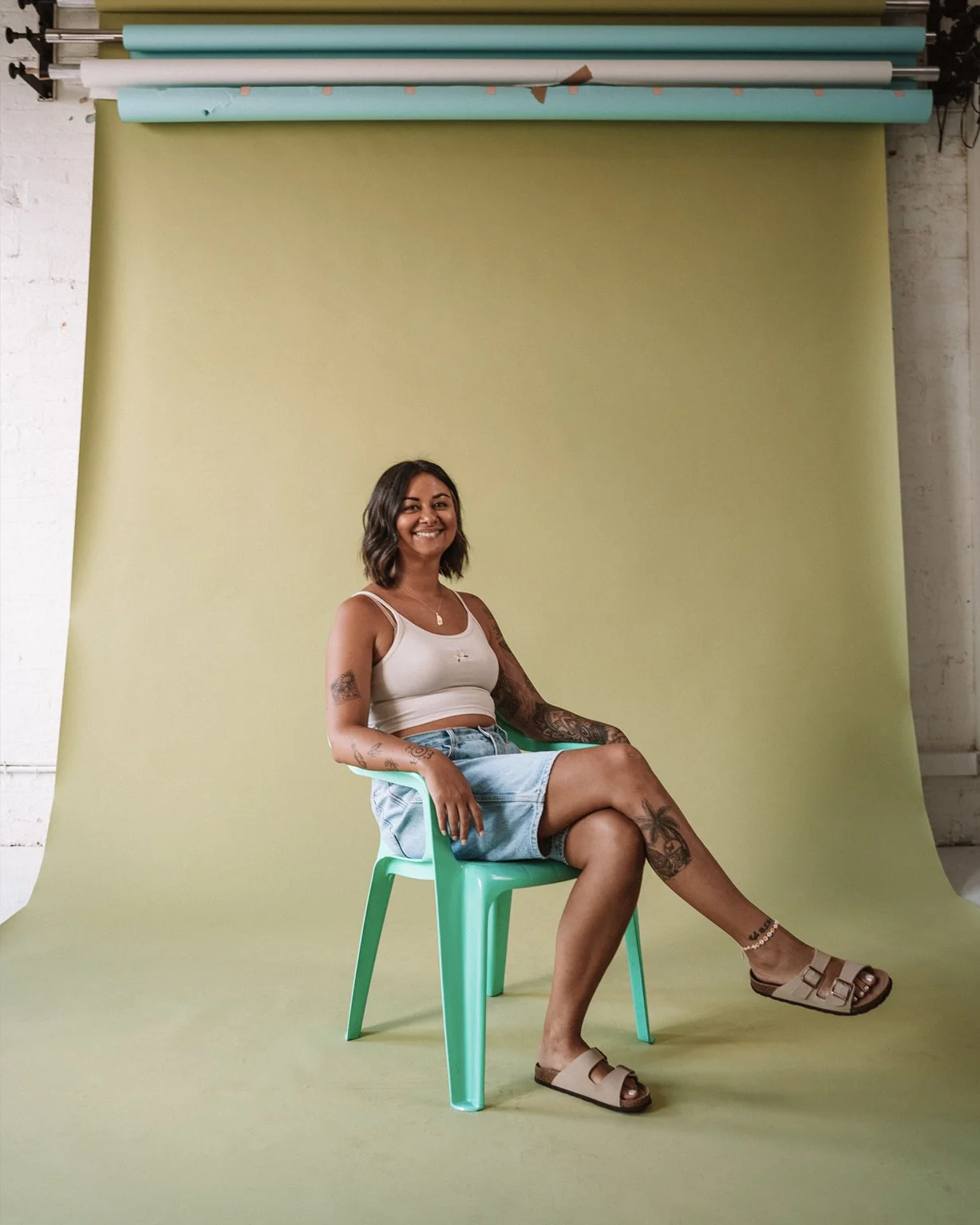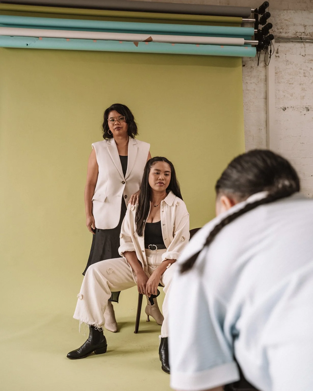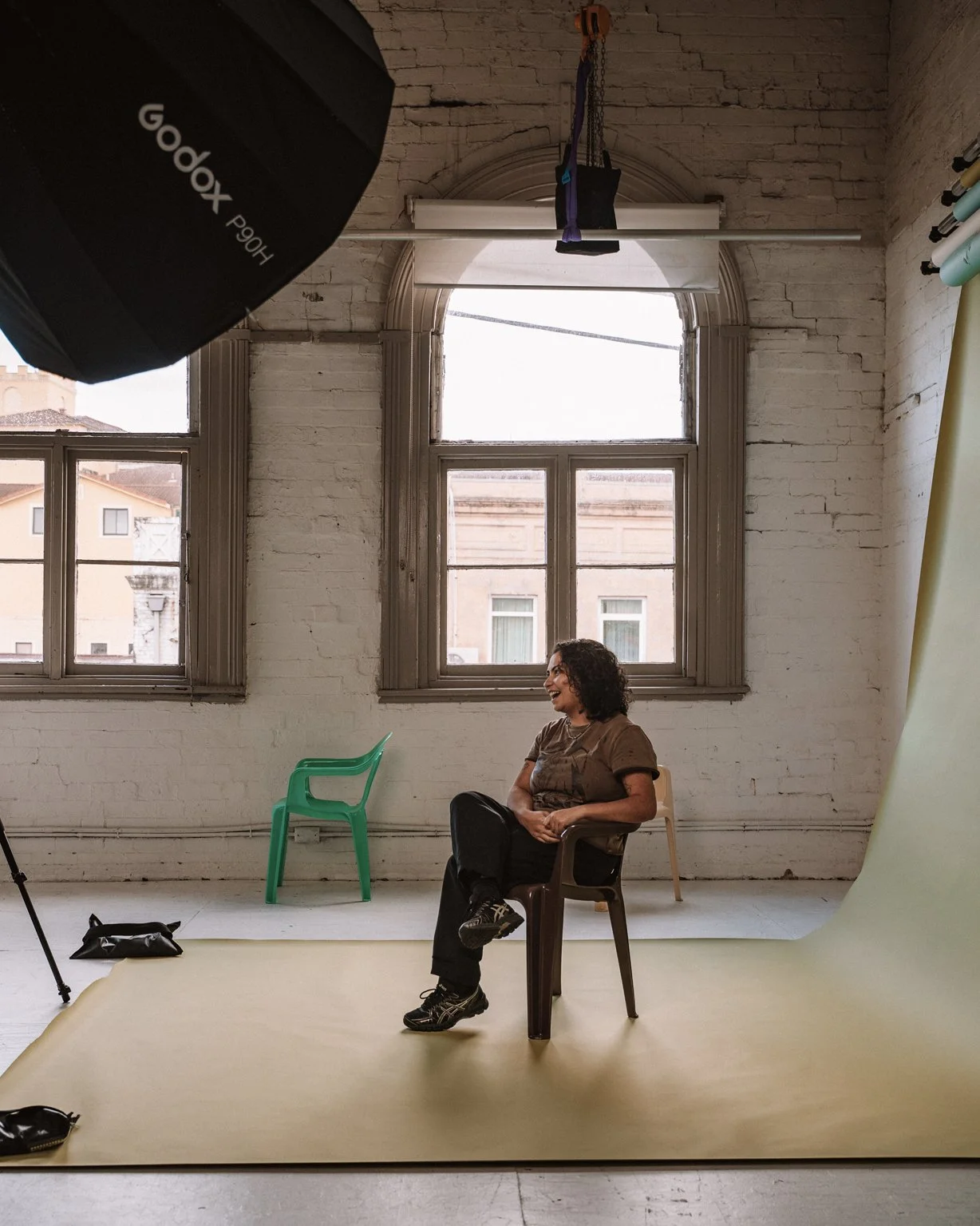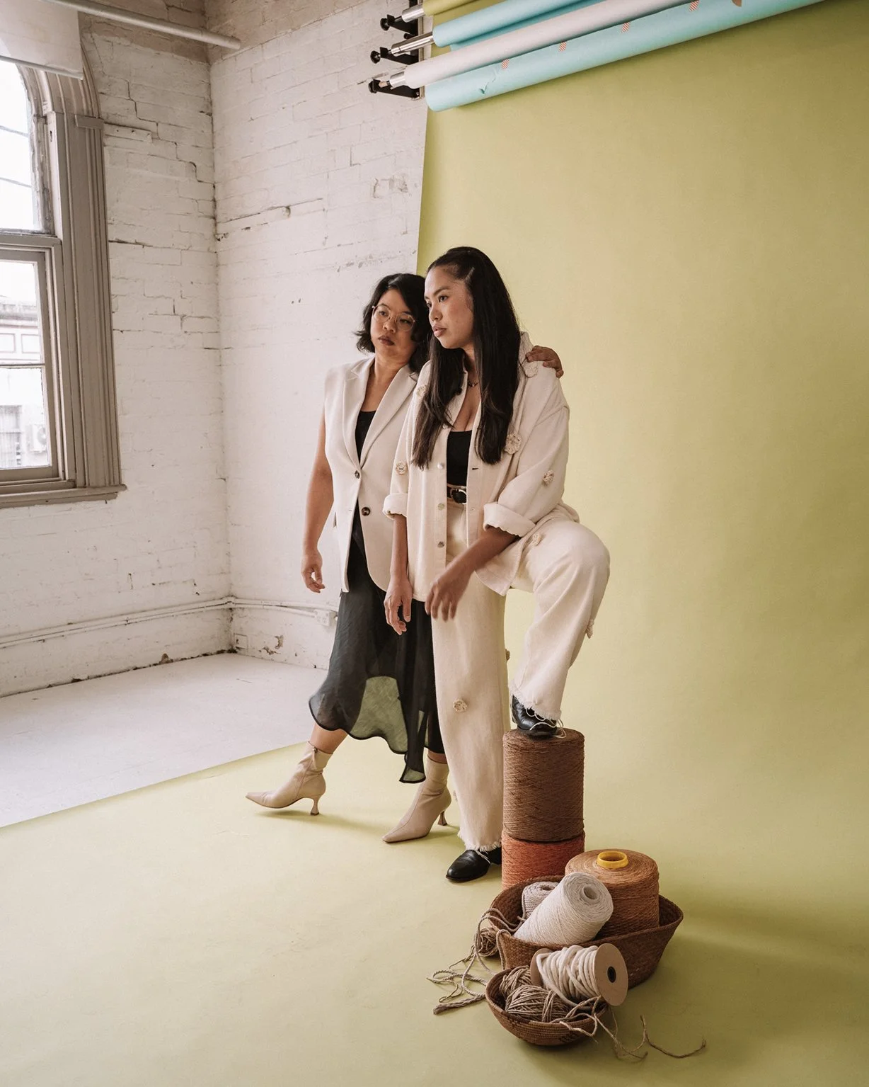 Even before they spoke, you could tell Lauren and Kass were sisters. They were perfectly in sync. As the duo behind Crossing Threads, their creative rhythm is instinctive – years of working side by side showing up in the way they move, think and respond to each other. In front of the camera, there was no hesitation. Just clarity, confidence and a strong sense of identity. Their back-to-back portrait on the plastic chairs was instantly iconic.