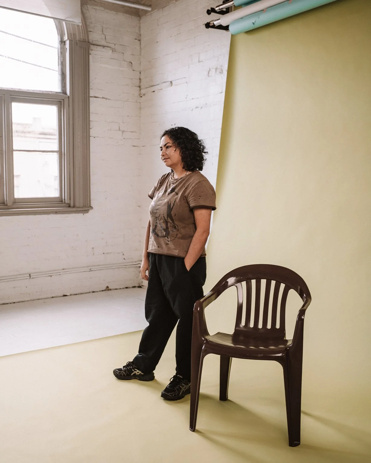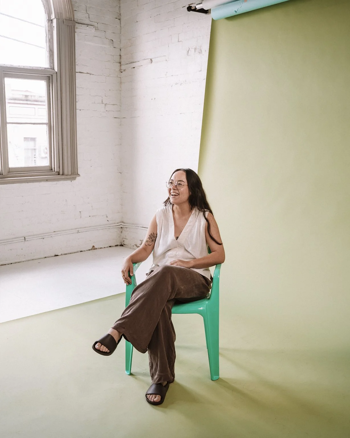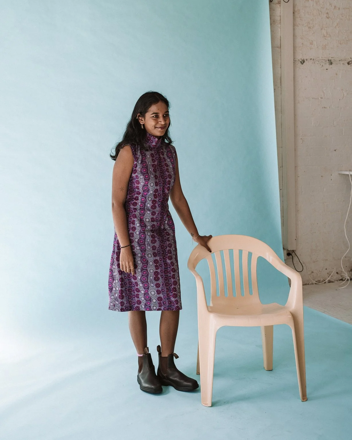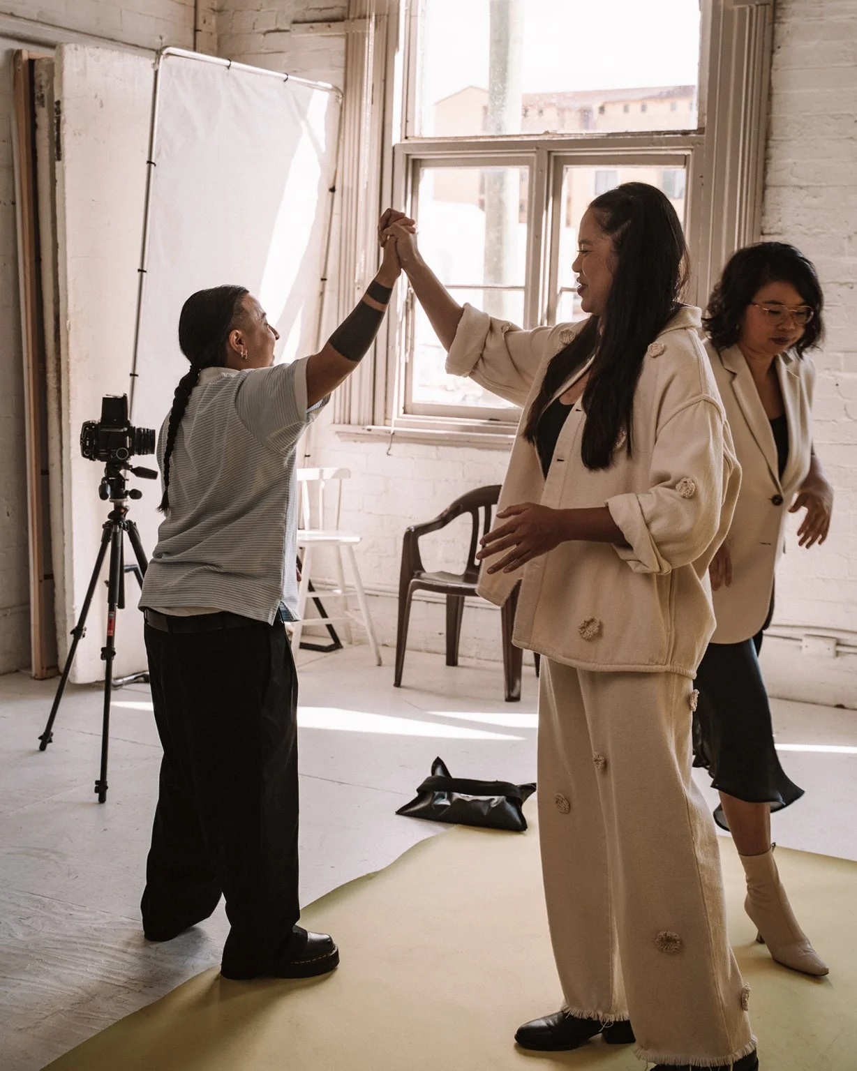 Even before they spoke, you could tell Lauren and Kass were sisters. They were perfectly in sync. As the duo behind Crossing Threads, their creative rhythm is instinctive – years of working side by side showing up in the way they move, think and respond to each other. In front of the camera, there was no hesitation. Just clarity, confidence and a strong sense of identity. Their back-to-back portrait on the plastic chairs was instantly iconic.